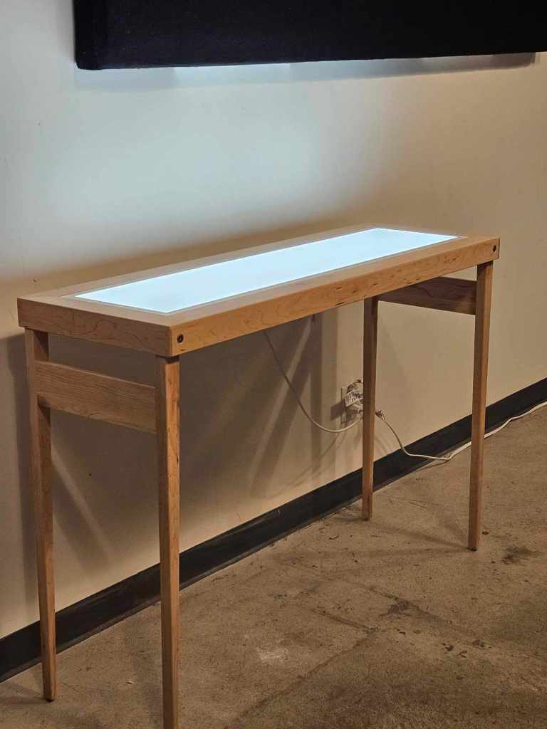 Alexandre McLean, museum technician, has long installed exhibitions at the Musée d’art Contemporain de Montréal. Alex creates the custom luminous wall mounted & standalone tables, panels, and display stands that our jewelers use to present their creations. Any artist or designer seeking custom luminous tables or panels can contact him at Podalx@yahoo.com. Two unique maple wood framed standalone tables (L48’’xW12’’xH30’’) will be available for renting after the exhibition. He also contributes to the installation of our exhibitions. Alex has his woodworking studio in the Allied building in the Mile End.